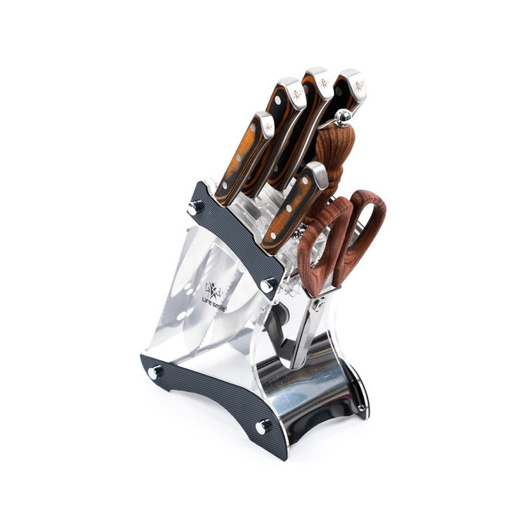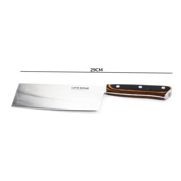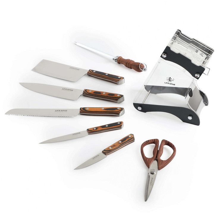 برند لایف اسمایل، یکی از معتبرترین برندهای تولید لوازم آشپزخانه (اعم از سرویس قابلمه، سرویس کارد و ساطور ، کتری قوری و ...) است که با کیفیت فوق العاده و تنوع های زیاد در این زمینه فعالیت میکند. سرویس های کارد ساطور این شرکت با ظاهری بسیار شیک و تنوع های زیاد در چاقو همه نیاز های شما رو در برش دادن انواع مواد غذایی در خانه رفع میکند. این سرویس 8 پارچه شامل یک قیچی برای قطعه قطعه کردن مرغ و بوقلمون، یک شارپنر برای تیز کردن چاقوها، یک ساطور برای تکه کردن و ساطوری کردن مواد غذایی، یک چاقو سرآشپز برای خرد کردن میوه و سبزی و ... ، یک چاقو نان برای برش دادن انواع نان بدون خورد شدن آنها، دو عدد چاقوی استخوانی برای پوست کندن مواد غذایی و همچنین جدا کردن غضروف ها و رگ های گوشت و مرغ ، یک استند برای نگه داشتن چاقو ها است. تیغه های این چاقوها لیزری و از جنس فولاد ضد زنگ است که به راحتی تیز میشود.
