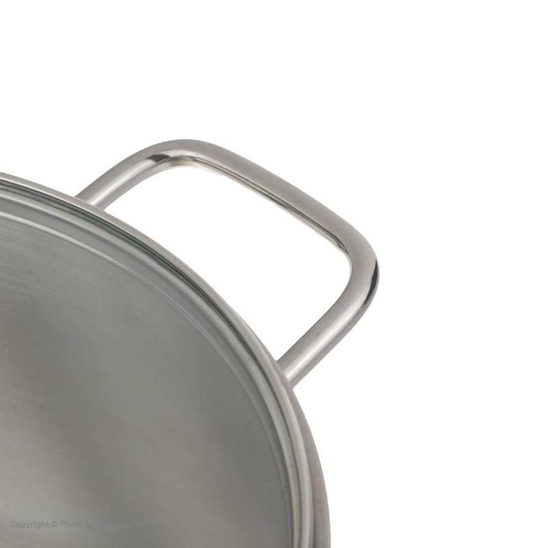 قابلمه از جنس استیل همراه با درب پیرکس که مانع از بیرون ریختن غذا از ظرف میشود. کف چدن کپسول دار این سرویس باعث ماندگاری بیشتر این محصول و مدیریت انتقال صحیح حرارت برای پخت غذا میشود. دستگیره های این کار به بدنه جوش خورده و به هیچ عنوان کنده نمیشود.