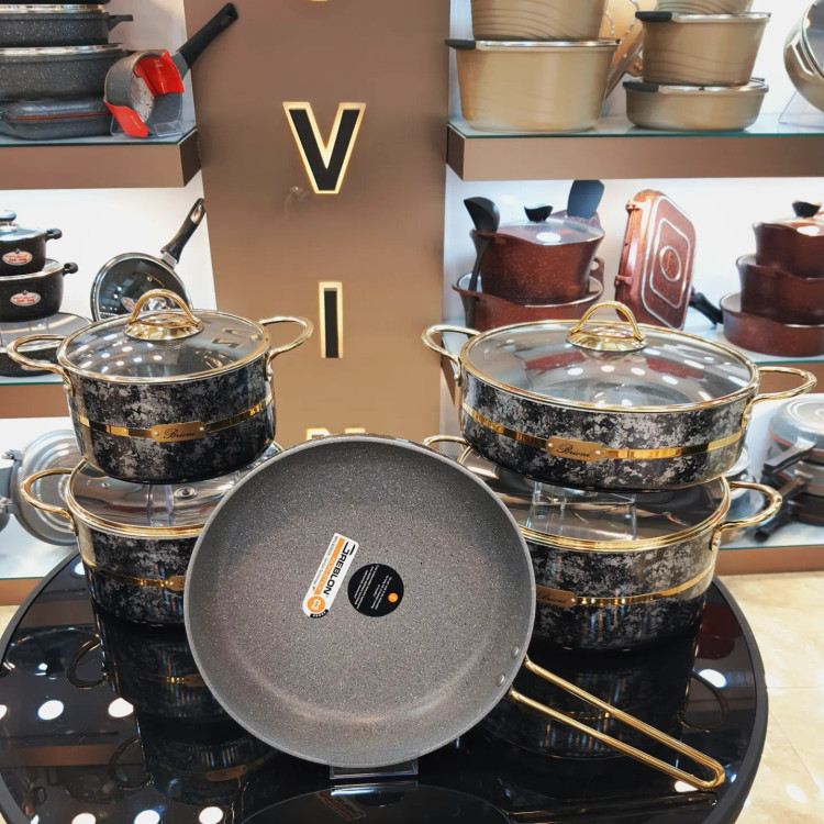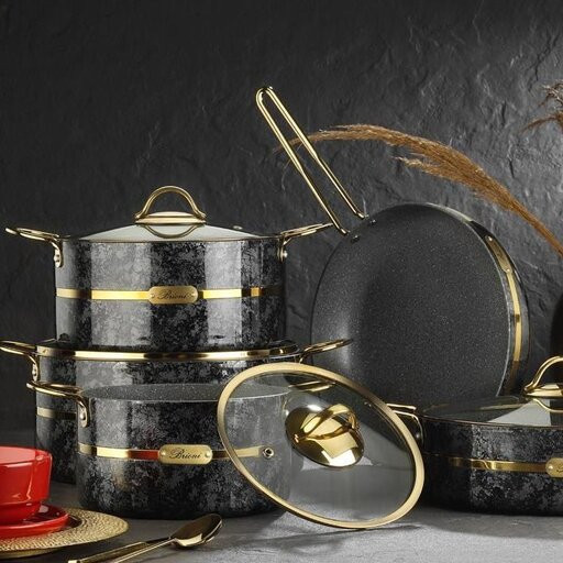 سرویس قابلمه 9 پارچه گرانیتی بریونی ترکیه ای، سرویسی بسیار زیبا و چشم نواز برای آشپزخانه شما. با این سرویس شما میتوانید غذاهای رژیمی و بدون روغن نیز طبخ کنید.گرانیت داخلی این سرویس از برند گرابلون آلمانی است و بدون مواد مضر برای سلامتی شما از جمله PFOA و سرب میباشد. نوار کمربندی و دستگیره های طلایی این کار آبکاری شده است و در برابر حرارت سیاه یا هفت رنگ نمیشود.