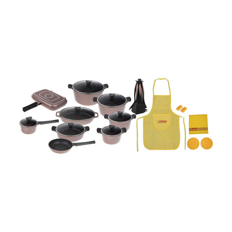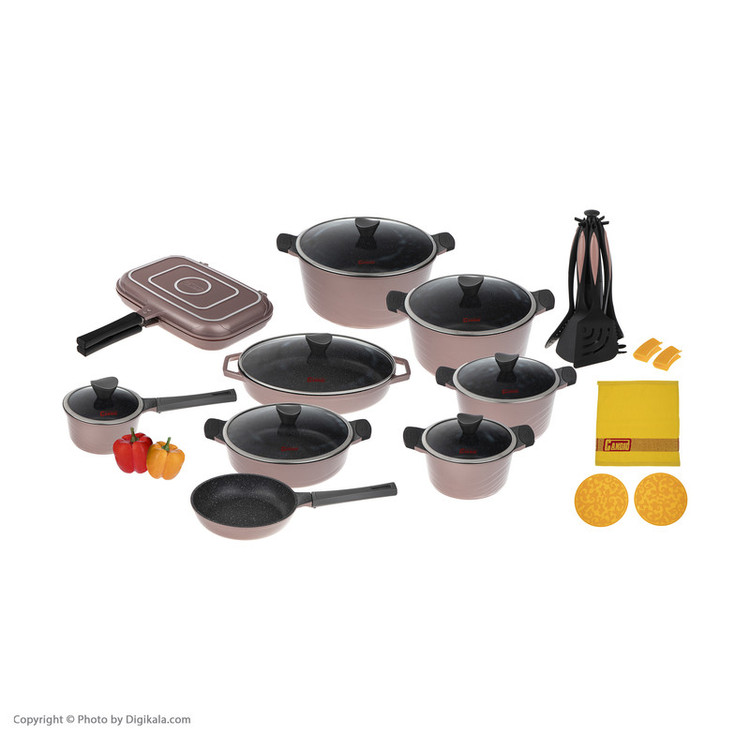 سرویس پخت و پز 30 پارچه کاندید مدل OCEAN با داشتن تنوع در سایز قابلمه و تابه، یکی از کاربردیترین لوازمی است که در هر آشپزخانه به آن نیاز است. در صورت داشتن تعداد زیادی مهمان یا برای خانوادههایی پرجمعیت، یک سرویس پخت با تنوع در سایز قابلمه از ضروریات است. روکش این کالا گرانیتی است؛ به همین دلیل از نچسببودن و شستوشوی آنها خیالتان آسوده خواهد بود. در این سرویس پختوپز توزیع حرارت در ظروف کاملا یکنواخت بوده و از ضخامت مطلوبی برخوردار است این محصول با 4 قابلمه در سایزهای 32 ، 28، 24و 20 و با داشتن 5 تابه با سایز در ابعاد گوناگون در مقایسه با سایر سرویس قابلمهها بسیار کامل است. در کنار این اقلام در بسته این کالا 3 عدد کفگیر یک قاشق آشپزی، یک عدد کفگیر اسپاگتی، 2 زیر قابلمهای، 1 عدد دستمال و یک عدد پیشبند وجود دارد.