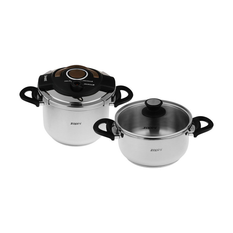 ست دوقلوی این محصول با ظرفیت 6 و 4 لیتری امکان پخت همزمان دو نوع غذا توسط زودپز و قابلمه در یک زمان را فراهم می کند . هنگامیکه فرصت اندکی برای آماده سازی غذا دارید این زودپز از طریق بدنه استیل و درب فولاد ضد زنگ با کیفیت 18/10 و کیفیت استاندارد 304 استیل، با حرارتی یکنواخت در تمام قسمتها سریعترین غذا را با حفظ ارزشهای غذایی در اختیار شما قرار میدهد. جنس دستگیرهها از نوع باکالیت طراحی شده که در مقابل حرارت مقاوم هستند تا در زمان پخت آسیبی به آنها وارد نشود. درب این زودپز با فشار یک دست به راحتی باز و بسته میشود و کار کردن با آن بسیار راحت است. کف کالا ازجنس فولاد ضد زنگ و آلومینیوم می باشد و به دلیل قابلیت کپسولی بودن این مزیت را دارد که حرارت را به طور یک نواخت به تمام قسمت ها برساند .