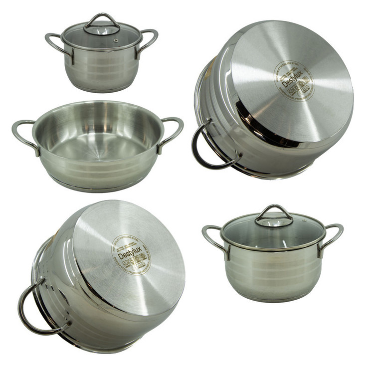 قابلمه ها از جنس استیل همراه با درب پیرکس که مانع از بیرون ریختن غذا از ظرف میشود. کف چدن کپسول دار این سرویس باعث ماندگاری بیشتر این محصول و مدیریت انتقال صحیح حرارت برای پخت غذا میشود. دستگیره های این کار به بدنه جوش خورده و به هیچ عنوان کنده نمیشود.